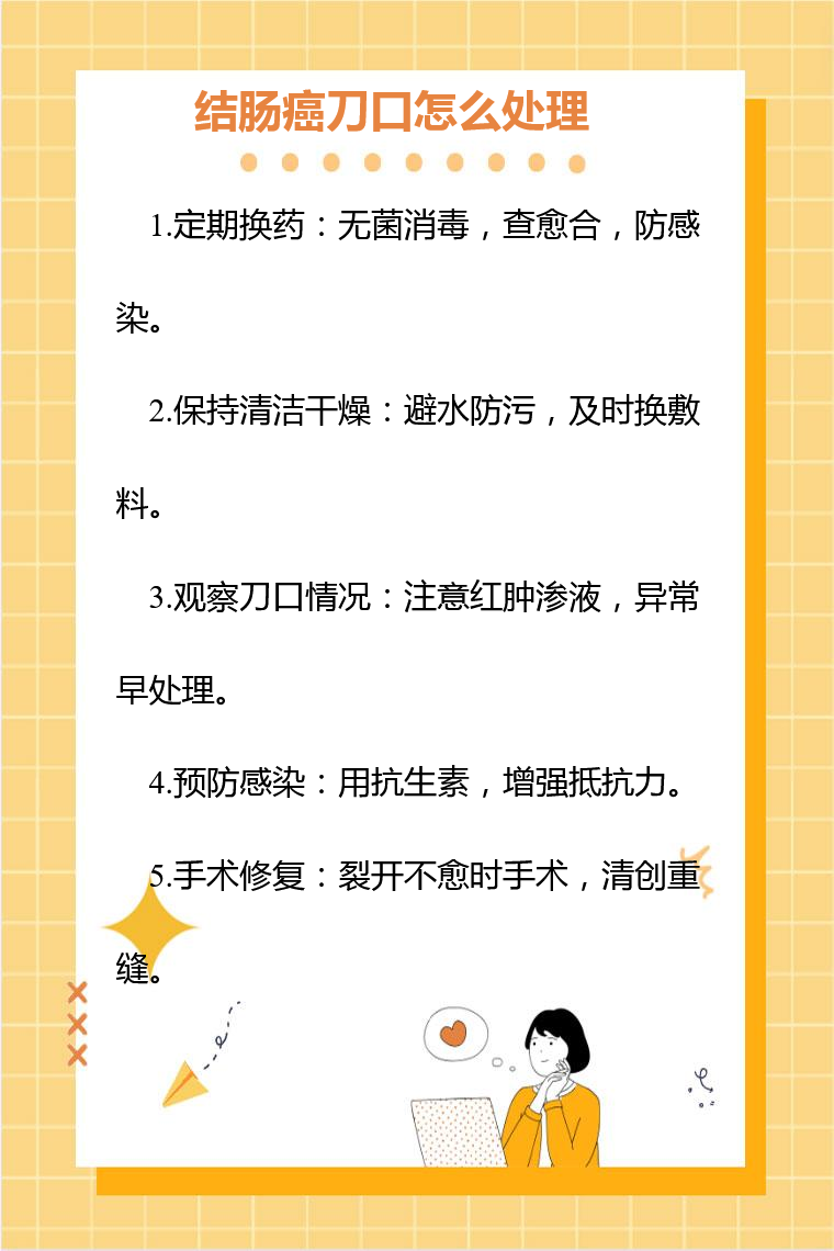 结肠癌刀口的处理方法包括定期换药、保持清洁干燥、观察刀口情况、预防感染、必要时手术修复等。
