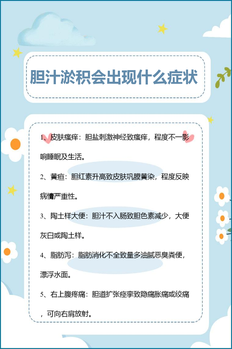 胆汁淤积会出现皮肤瘙痒、黄疸、陶土样大便、脂肪泻、右上腹疼痛等症状。