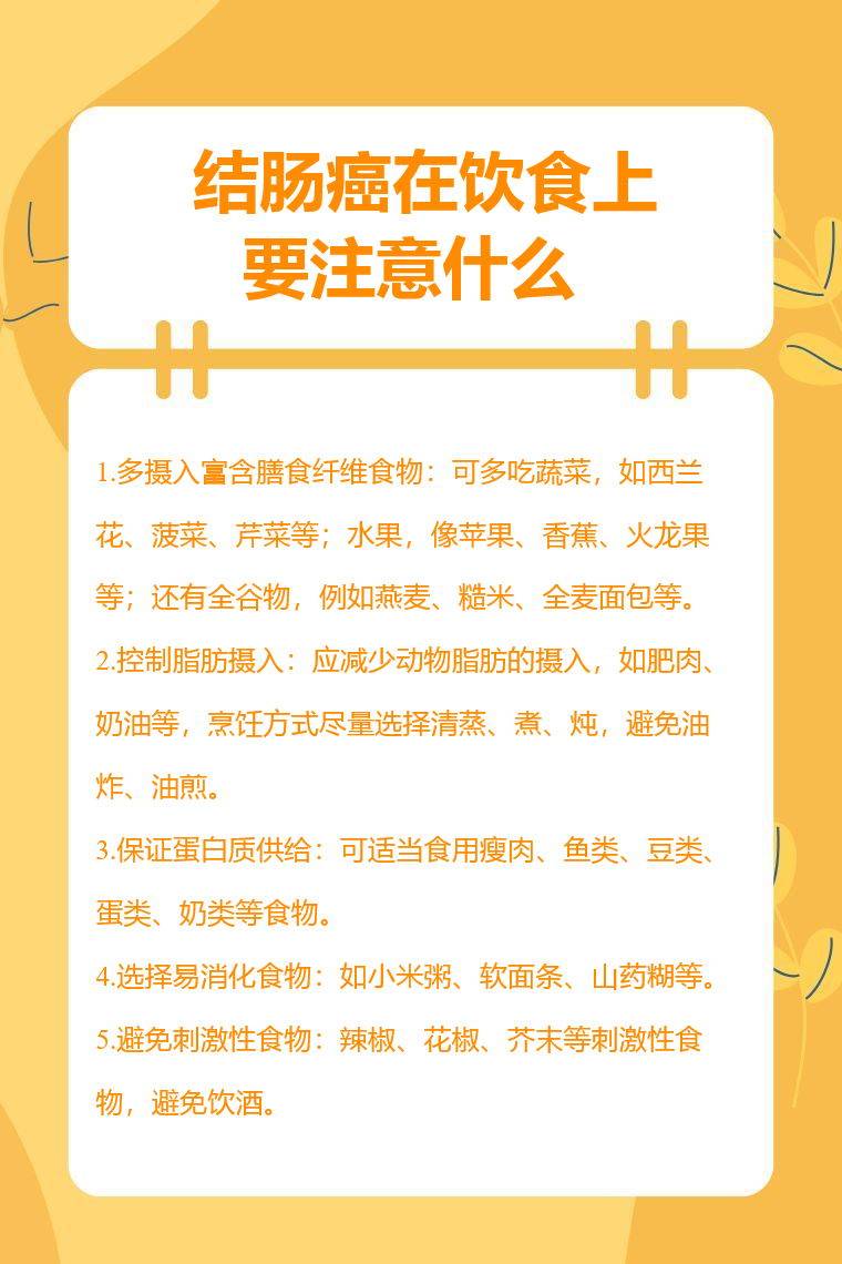 结肠癌患者在饮食上要注意多摄入富含膳食纤维食物、控制脂肪摄入、保证蛋白质供给、选择易消化食物、避免刺激性食物等。