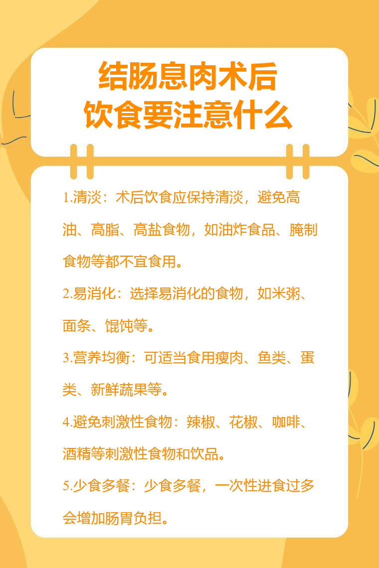 结肠息肉术后患者饮食要注意清淡、易消化、营养均衡、避免刺激性食物、少食多餐等。
