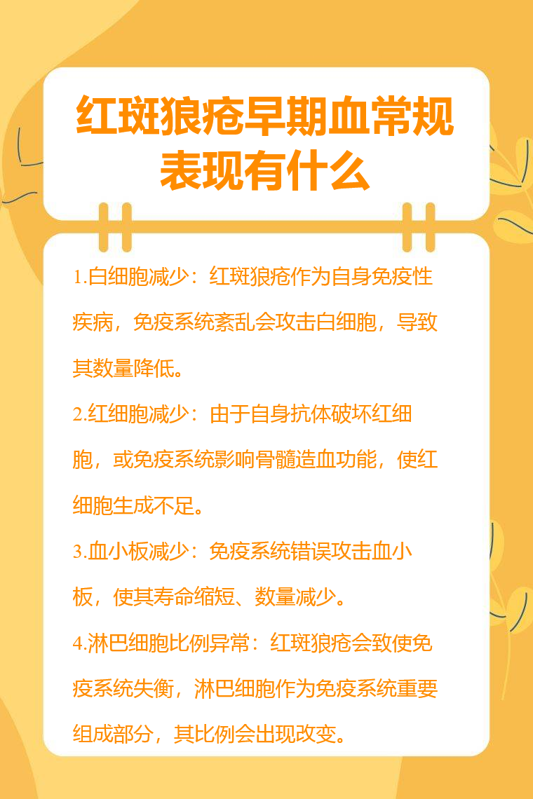 红斑狼疮早期血常规表现有白细胞减少、红细胞减少、血小板减少、淋巴细胞比例异常等。