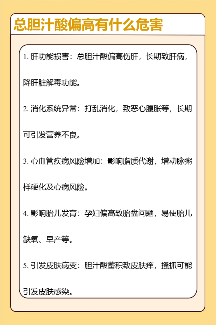 总胆汁酸偏高可能引发肝功能损害、消化系统异常、心血管疾病风险增加、影响胎儿发育、引发皮肤病变等。