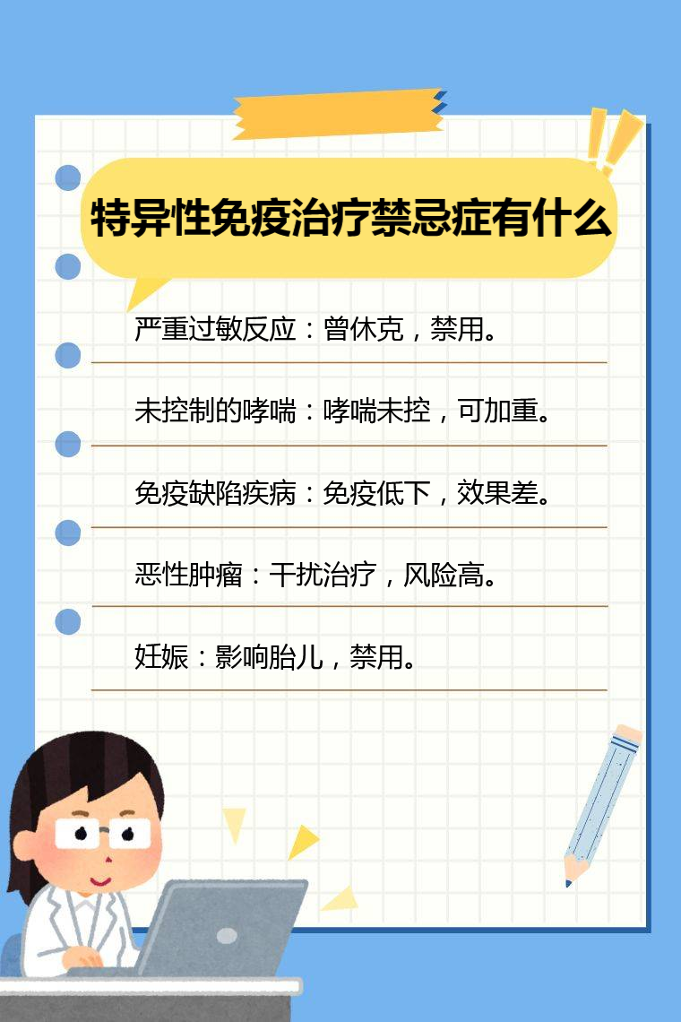 特异性免疫治疗禁忌症有严重过敏反应、未控制的哮喘、免疫缺陷疾病、恶性肿瘤、妊娠等。