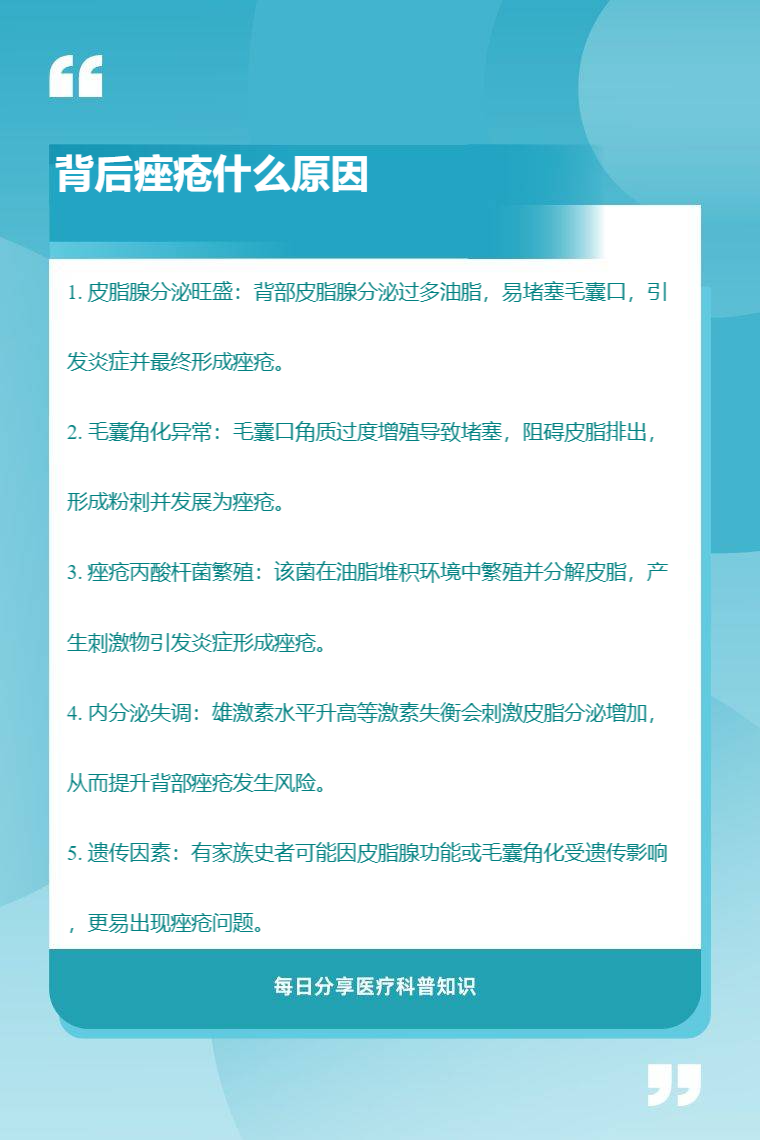 背后痤疮常见原因有皮脂腺分泌旺盛、毛囊角化异常、痤疮丙酸杆菌繁殖、内分泌失调、遗传因素等。