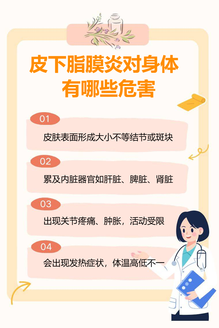 皮下脂膜炎可引发皮肤损害、脏器功能损伤、关节肌肉症状、发热乏力等危害。