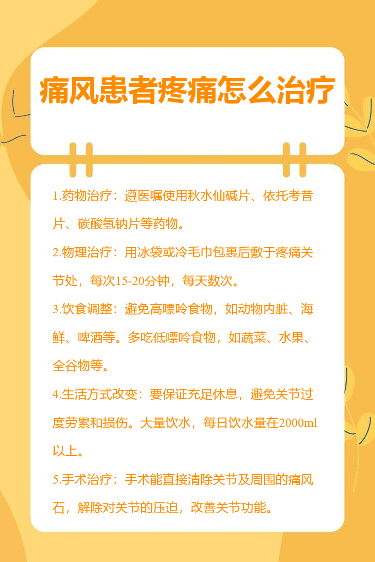 1.药物治疗:痛风患者疼痛发作时,遵医嘱使用秋水仙碱片、依托考昔片、碳酸氢钠片,可有效减轻炎症、缓解疼痛。秋水仙碱能抑制白细胞趋化,减轻炎症反应;依托考昔作为非甾体抗炎药,可抑制环氧化酶活性,减少前列腺素合成,从而止痛;碳酸氢钠可碱化尿液,促进尿酸排泄,降低尿酸浓度,减轻对关节等部位的刺激,缓解疼痛。