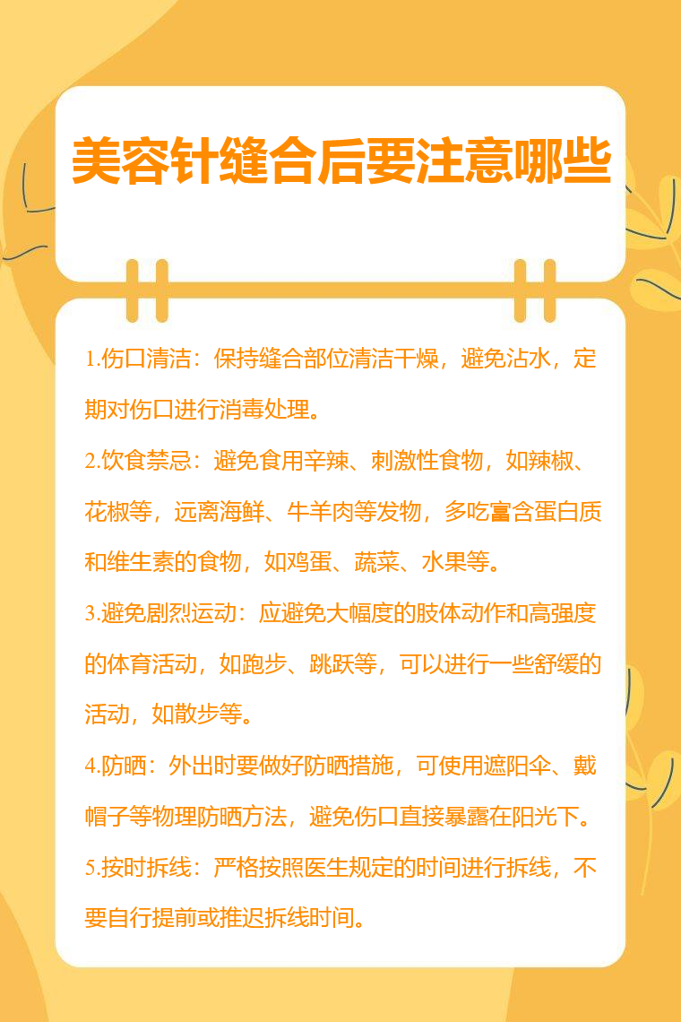 美容针缝合后患者要注意伤口清洁、饮食禁忌、避免剧烈运动、防晒、按时拆线等。