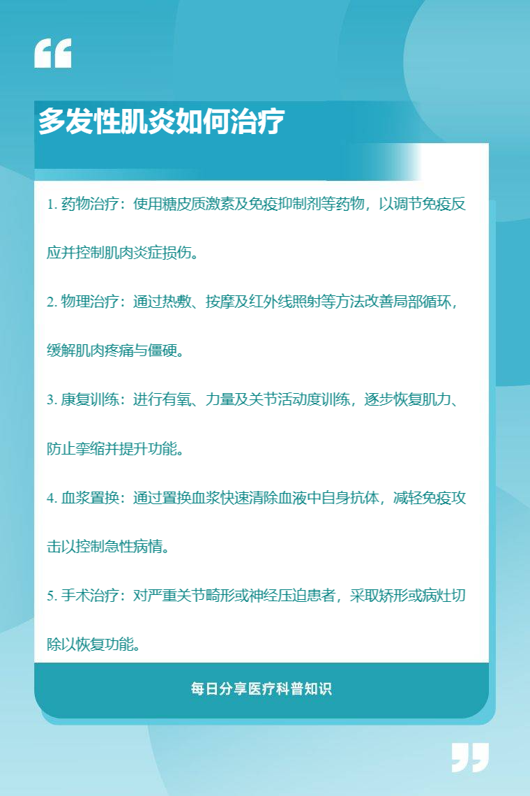 多发性肌炎的治疗方法主要有药物治疗、物理治疗、康复训练、血浆置换、手术治疗等。