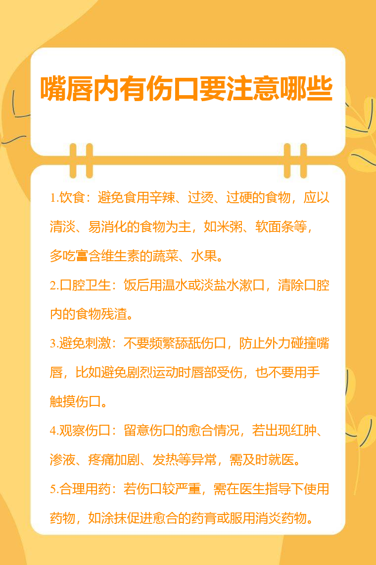 嘴唇内有伤口要注意饮食、口腔卫生、避免刺激、观察伤口、合理用药等。