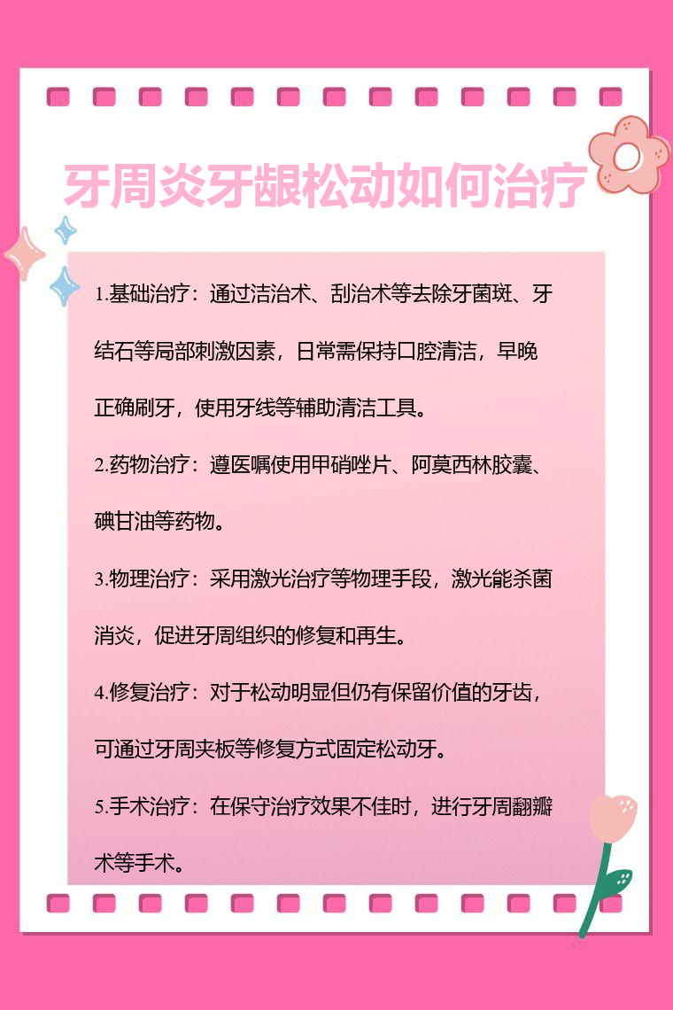 牙周炎牙龈松动的治疗方法有基础治疗、药物治疗、物理治疗、修复治疗、手术治疗等。