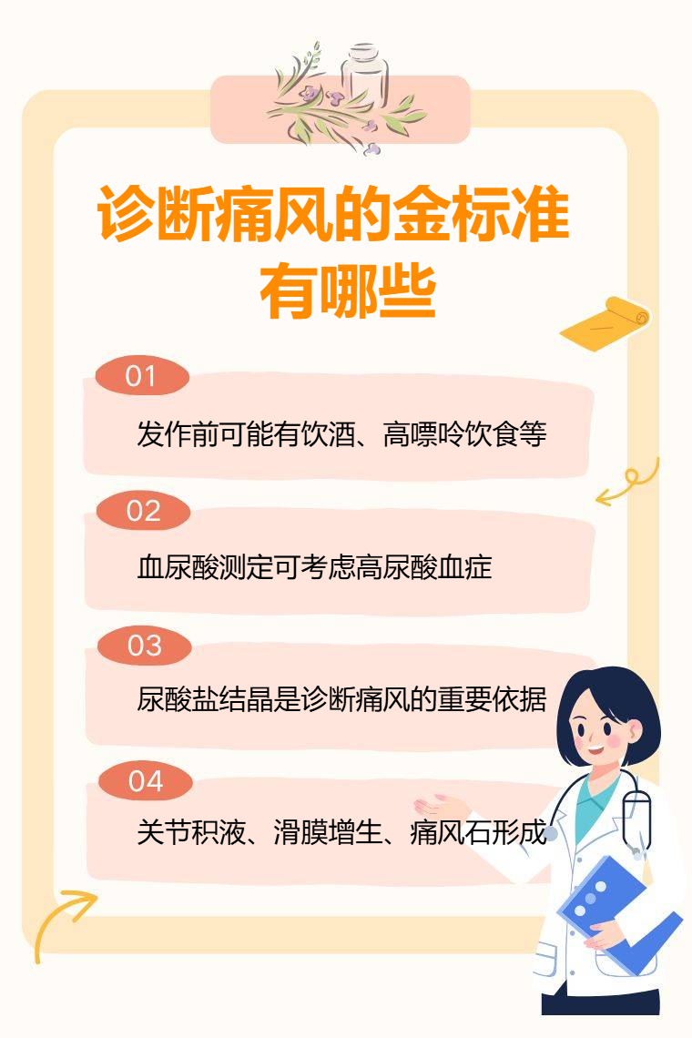 诊断痛风的金标准有临床症状、血尿酸测定、关节液或痛风石检查、影像学检查等。