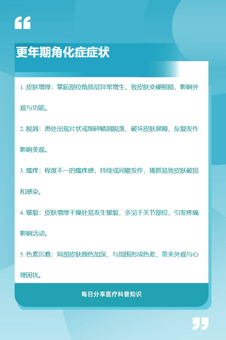 更年期角化症症状包括皮肤增厚、脱屑、瘙痒、皲裂、色素沉着等。