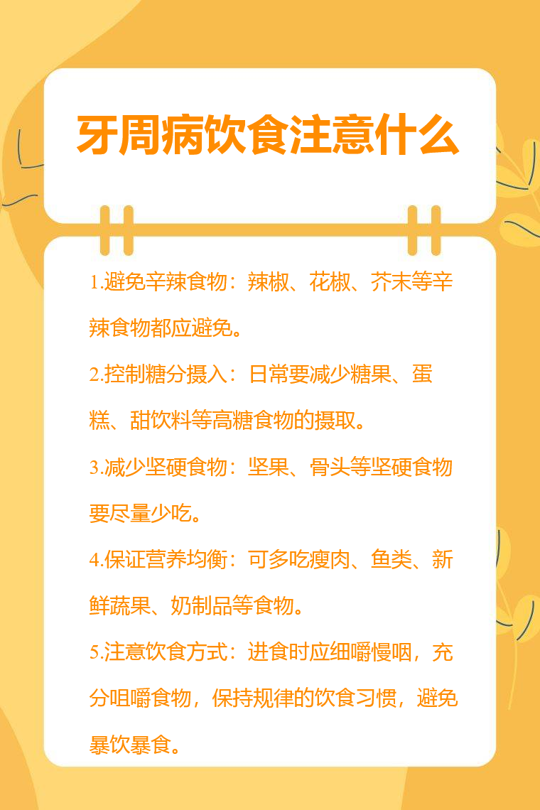 牙周病患者饮食需注意避免辛辣食物、控制糖分摄入、减少坚硬食物、保证营养均衡、注意饮食方式等。