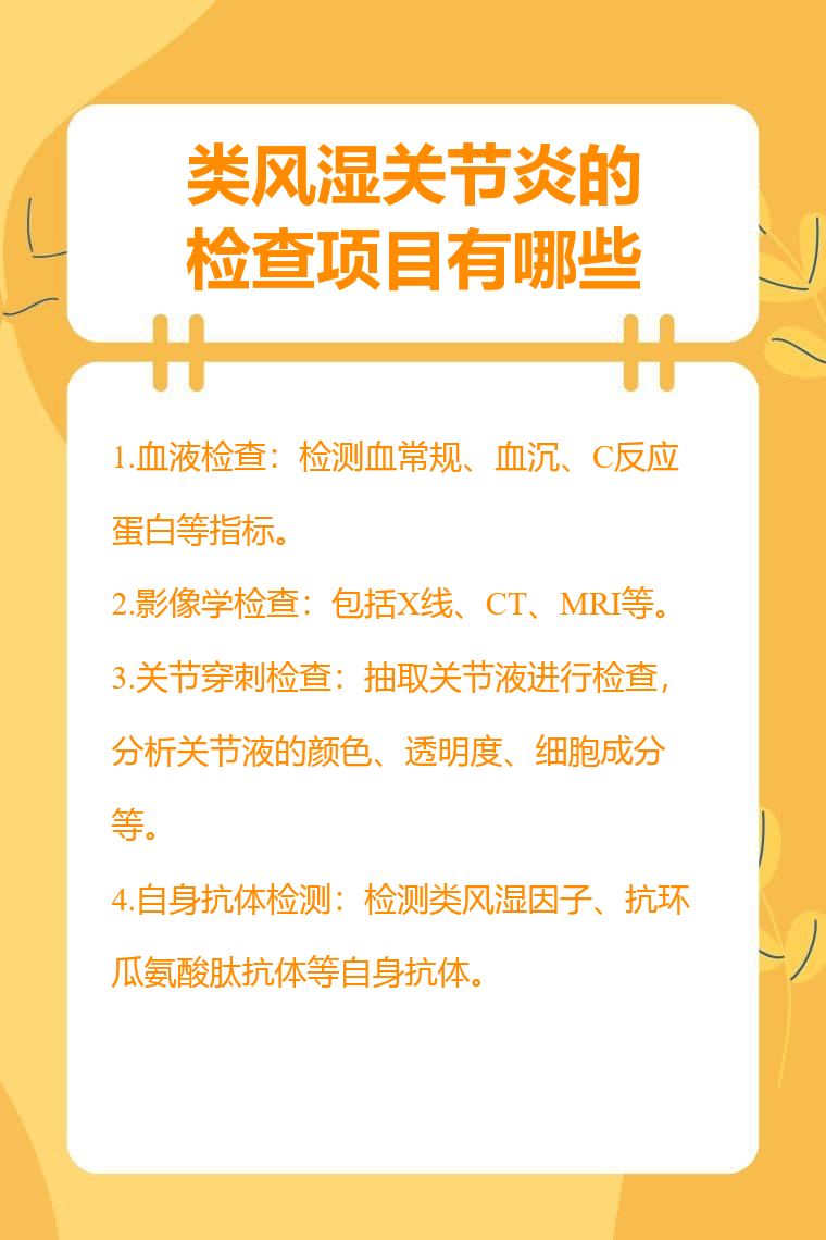 类风湿关节炎的检查项目有血液检查、影像学检查、关节穿刺检查、自身抗体检测等。