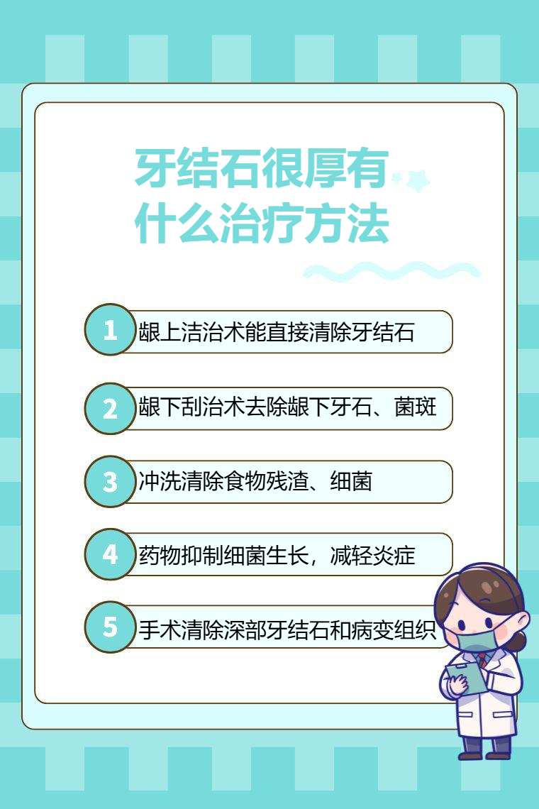 牙结石很厚可通过龈上洁治术、龈下刮治术、口腔冲洗、药物辅助治疗、手术治疗等方法处理。