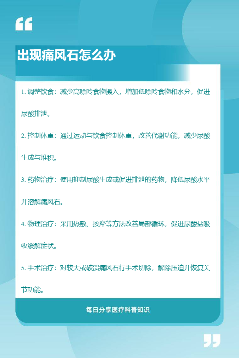 出现痛风石可通过调整饮食、控制体重、药物治疗、物理治疗、手术治疗等方法处理。