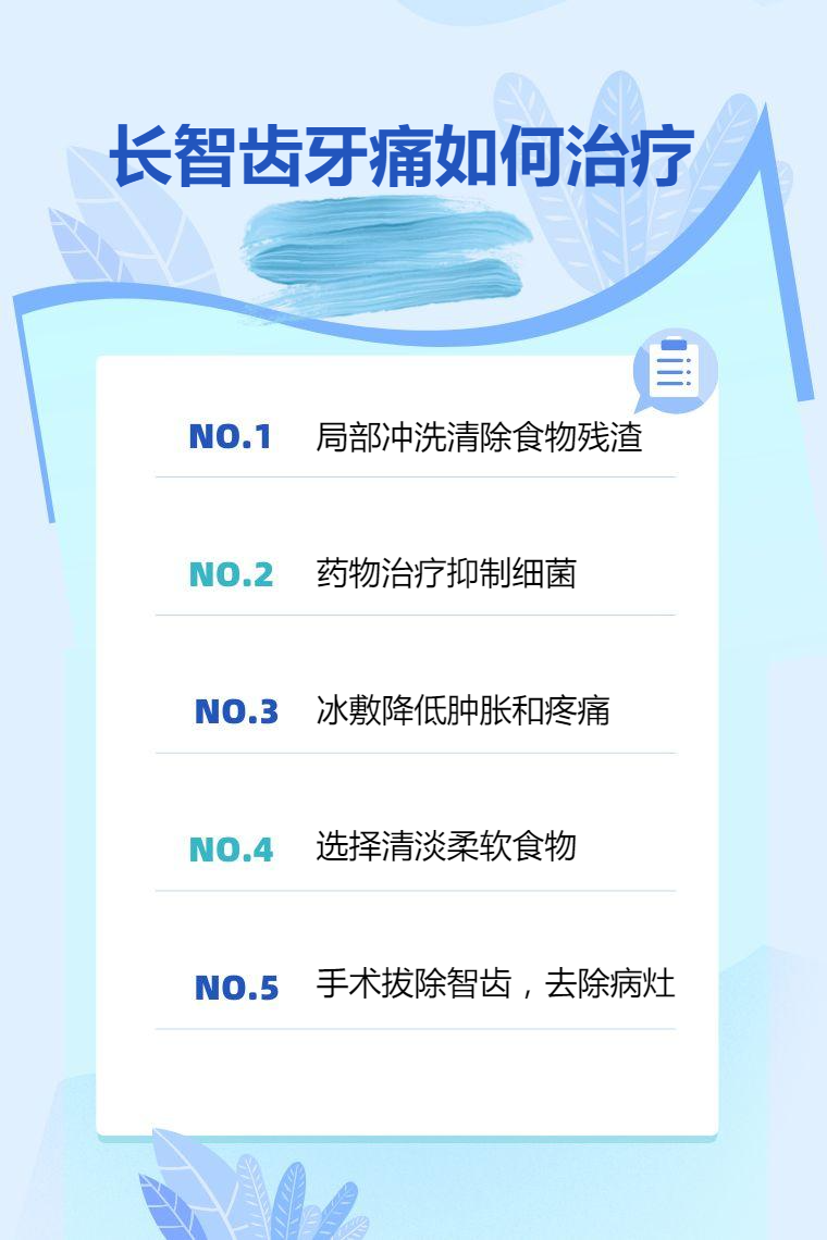 长智齿牙痛可通过局部冲洗、药物治疗、冰敷、调整饮食、手术拔除等方法治疗。