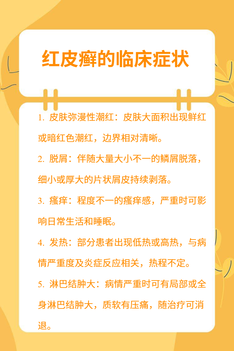 红皮癣的临床症状包括皮肤弥漫性潮红、脱屑、瘙痒、发热、淋巴结肿大等。