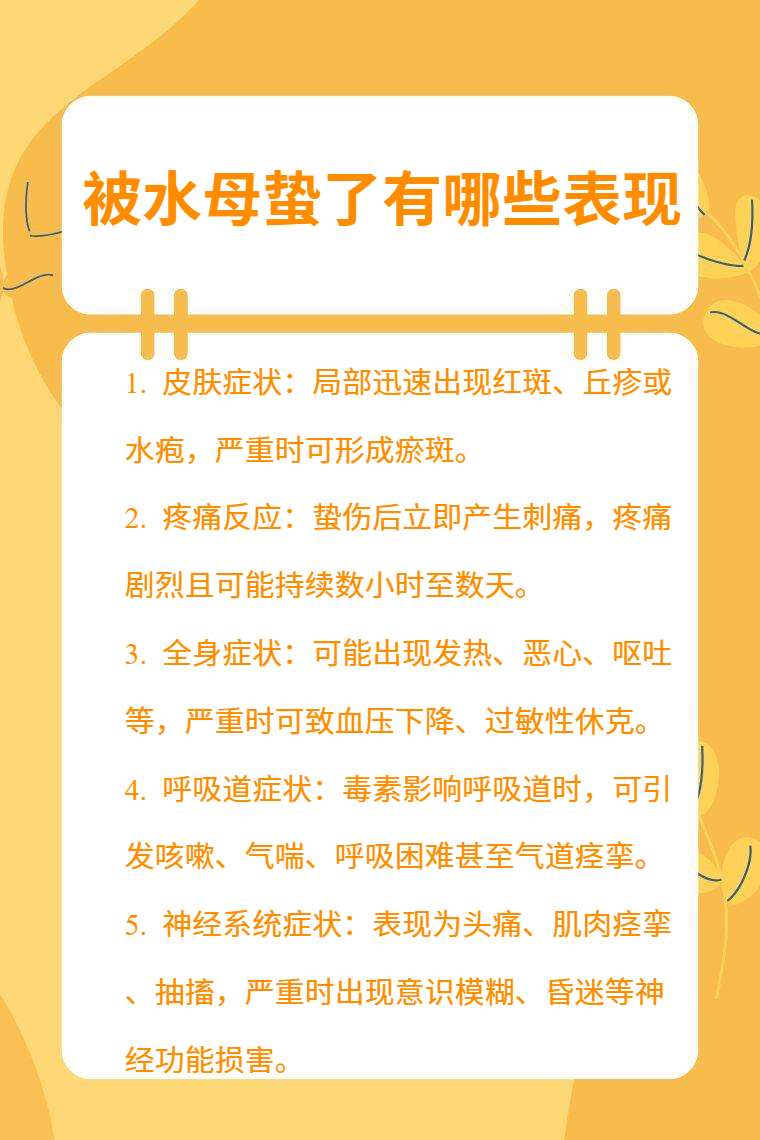 1. 皮肤症状:被水母蛰伤后,局部皮肤会迅速出现红斑、丘疹,形状不规则,大小不一,还可能形成水疱,疱壁紧张发亮,内含澄清或淡黄色液体,严重时皮肤会出现瘀斑、坏死,受损皮肤边界与水母接触部位相符。