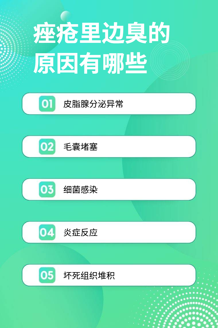 痤疮里边臭的原因有皮脂腺分泌异常、毛囊堵塞、细菌感染、炎症反应、坏死组织堆积等。