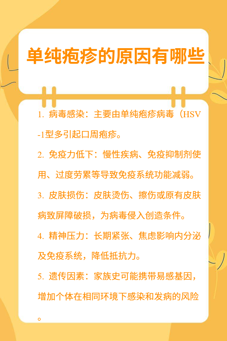 单纯疱疹的原因有病毒感染、免疫力低下、皮肤损伤、精神压力、遗传因素等。