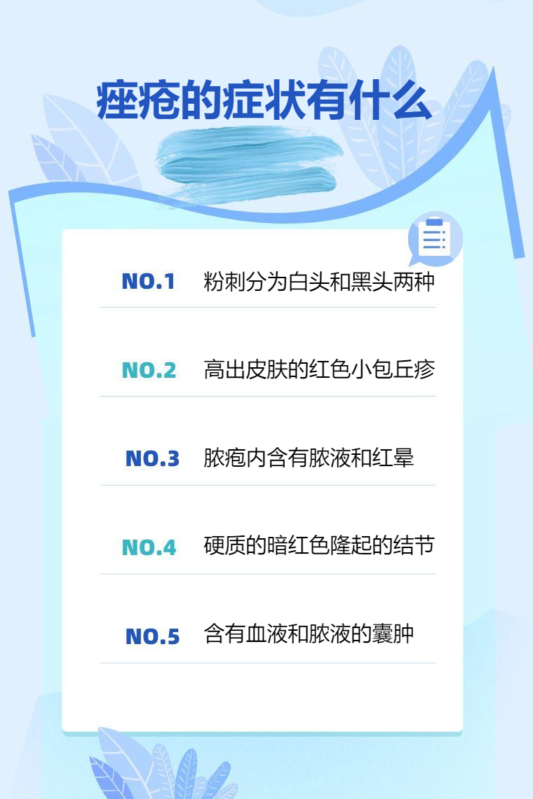 痤疮的症状有粉刺、丘疹、脓疱、结节、囊肿等。