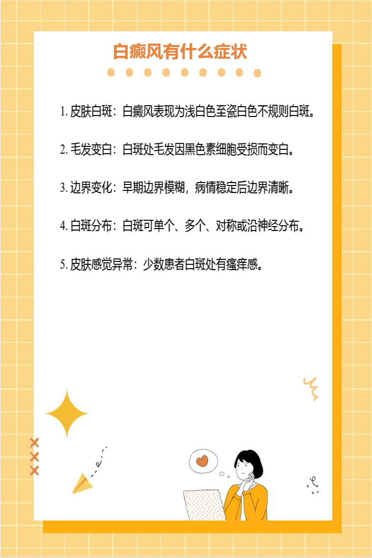 白癜风症状有皮肤白斑、毛发变白、边界变化、白斑分布、皮肤感觉异常等。