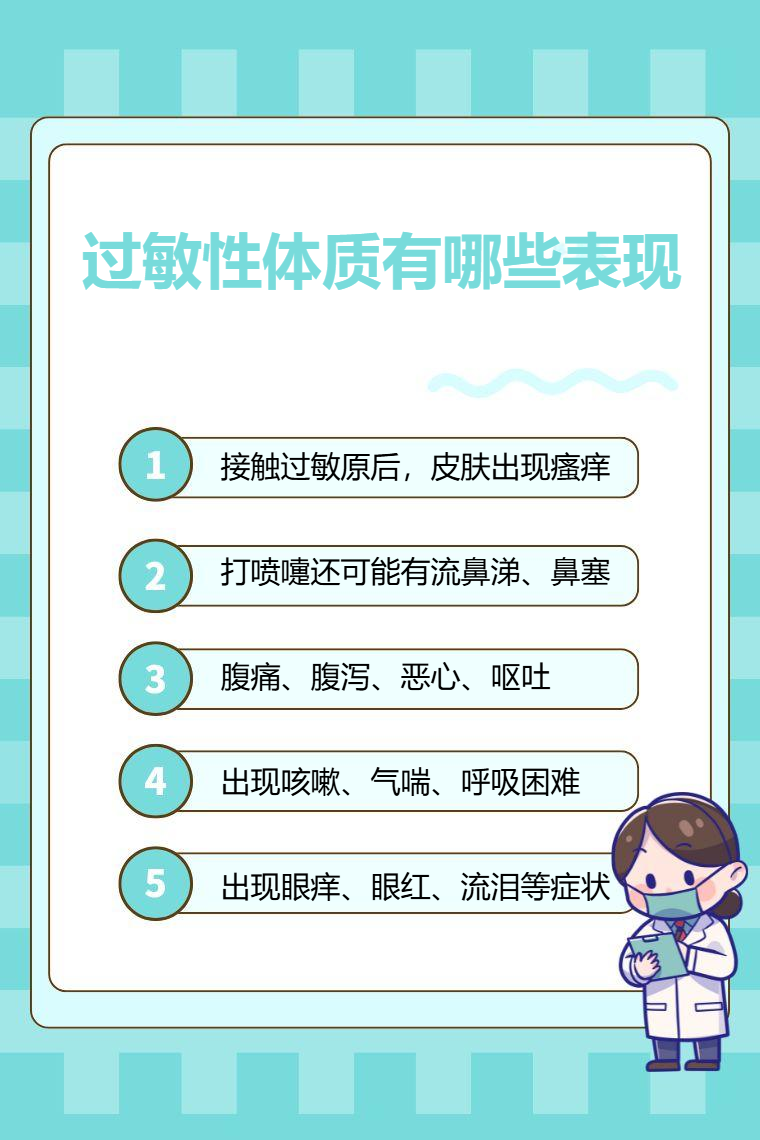过敏性体质常见表现有皮肤瘙痒、打喷嚏、胃肠道不适、呼吸道症状、眼部症状等。
