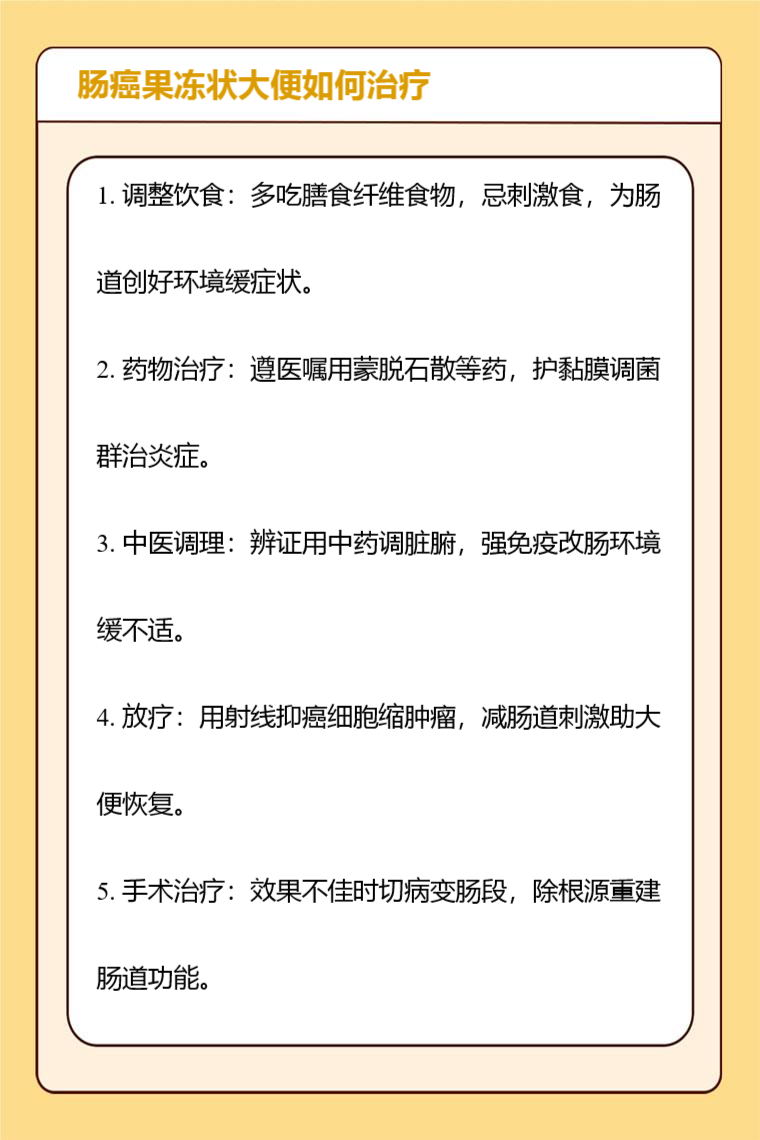 肠癌果冻状大便可通过调整饮食、药物治疗、中医调理、放疗、手术治疗等方法改善。
