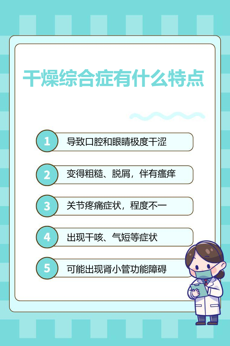 干燥综合症的特点包括口眼干燥、皮肤干燥、关节疼痛、肺部受累、肾脏受累等。