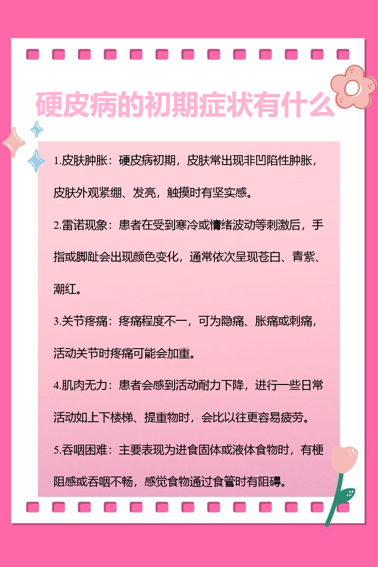 4.肌肉无力:硬皮病初期可能影响肌肉,导致肌肉无力。患者会感到活动耐力下降,进行一些日常活动如上下楼梯、提重物时,会比以往更容易疲劳,严重时可能影响正常的肢体运动功能。