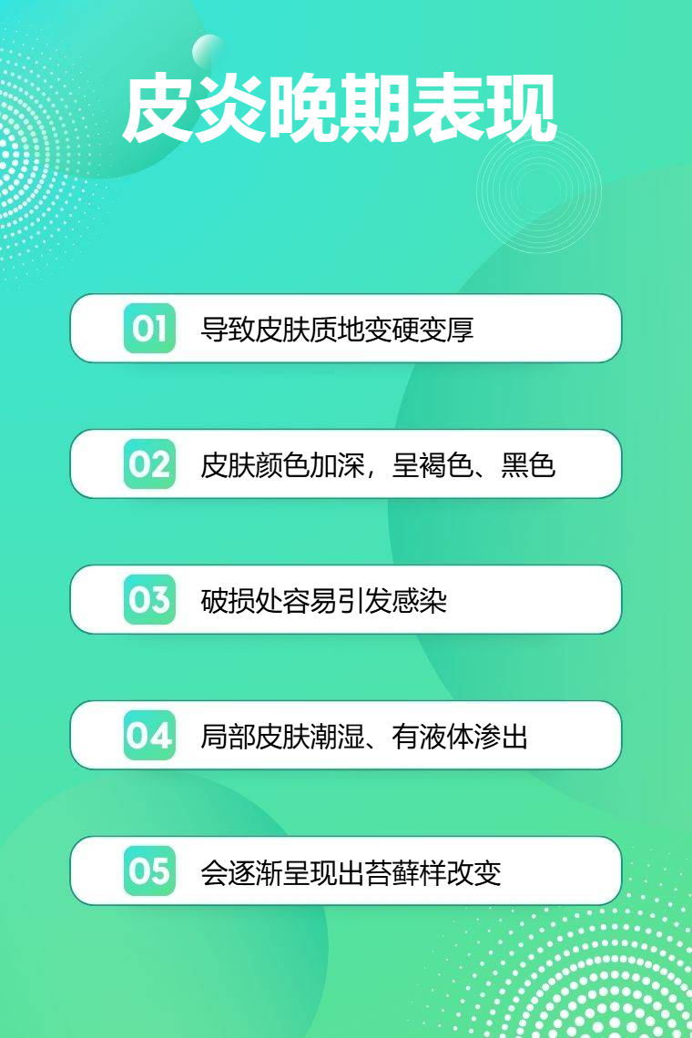 皮炎晚期表现有皮肤增厚、色素沉着、皮肤破损、渗液、苔藓样变等。