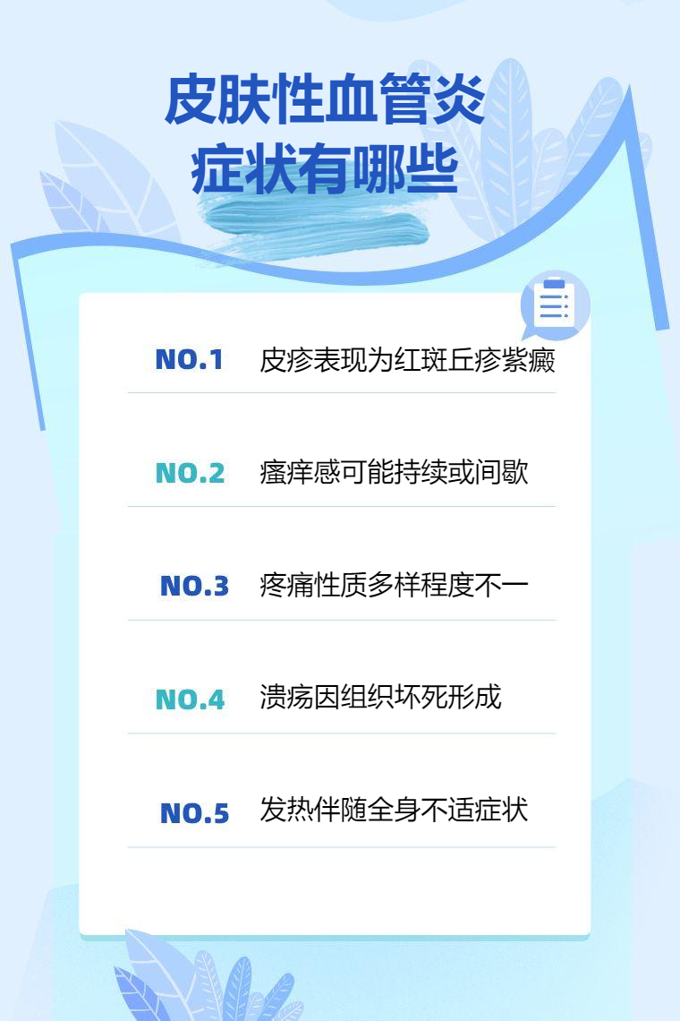 4. 溃疡:严重时皮肤可出现溃疡,多由于血管炎症影响局部血液循环,导致组织缺血坏死形成,溃疡面可能有渗出物,愈合相对缓慢,且容易继发感染。