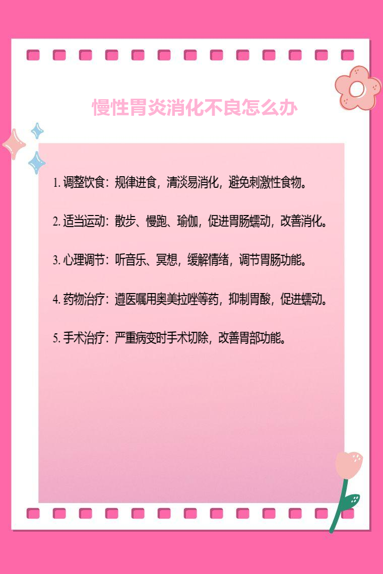 慢性胃炎消化不良可通过调整饮食、适当运动、心理调节、药物治疗、手术治疗等方法来应对。