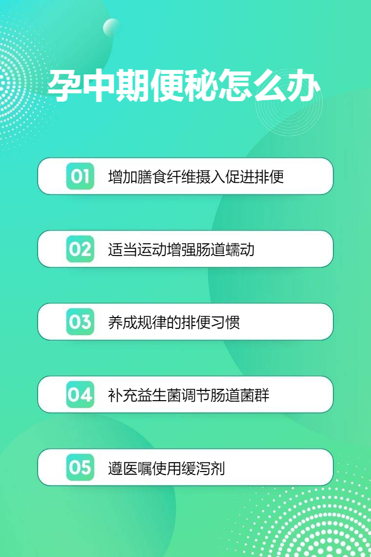 4. 补充益生菌:补充益生菌可调节肠道菌群,改善孕中期便秘。肠道内有益菌增多能抑制有害菌生长,改善肠道微生态环境,增强肠道功能,促进消化吸收和粪便排出,减轻便秘带来的不适。可选择双歧杆菌三联活菌胶囊、地衣芽孢杆菌活菌颗粒、枯草杆菌二联活菌肠溶胶囊等。