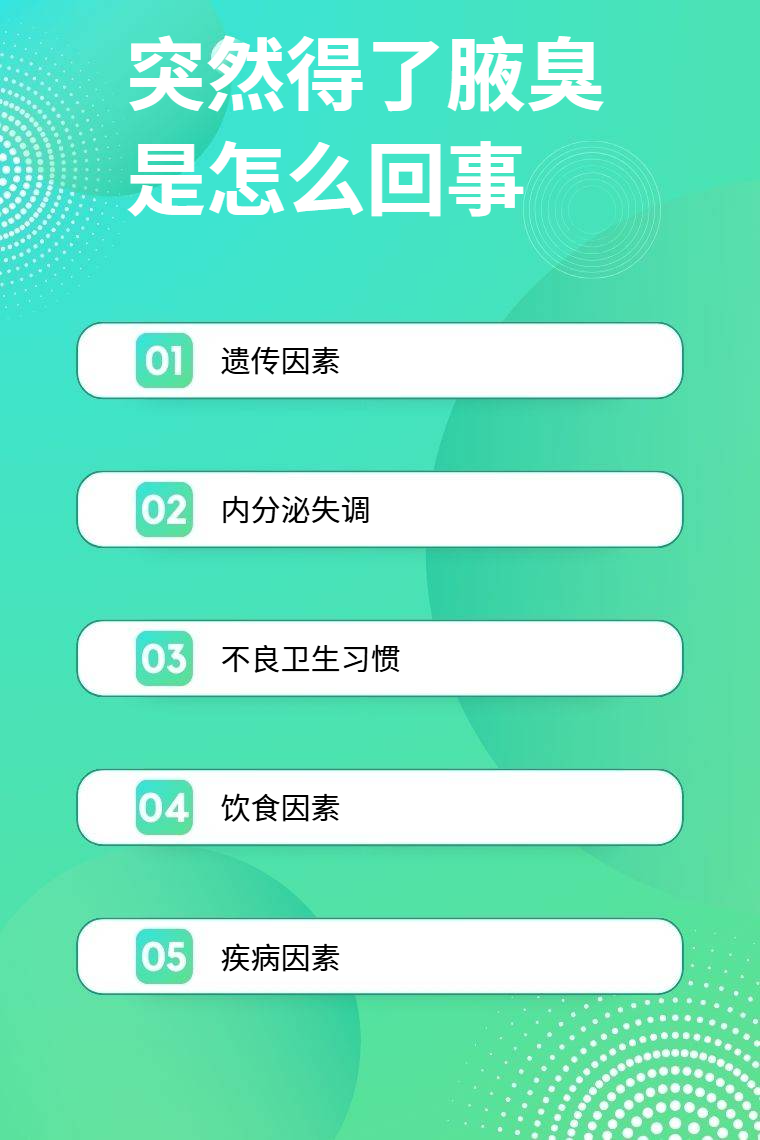 突然得了腋臭可能是由遗传因素、内分泌失调、不良卫生习惯、饮食因素、疾病因素等。