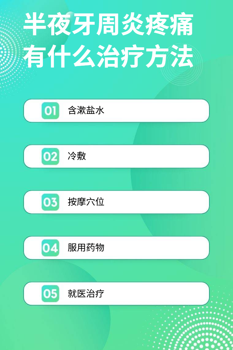 半夜牙周炎疼痛可以通过含漱盐水、冷敷、按摩穴位、服用药物、就医治疗等方法缓解。