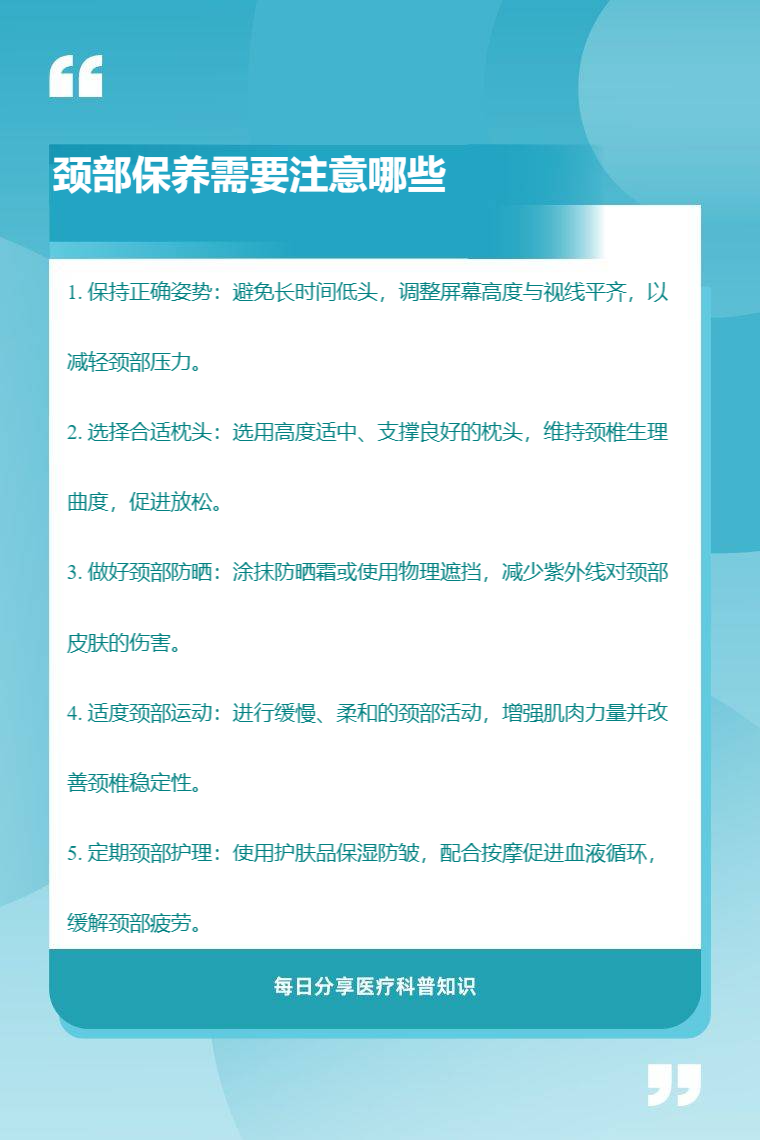 颈部保养需要注意保持正确姿势、选择合适枕头、做好颈部防晒、适度颈部运动、定期颈部护理等。
