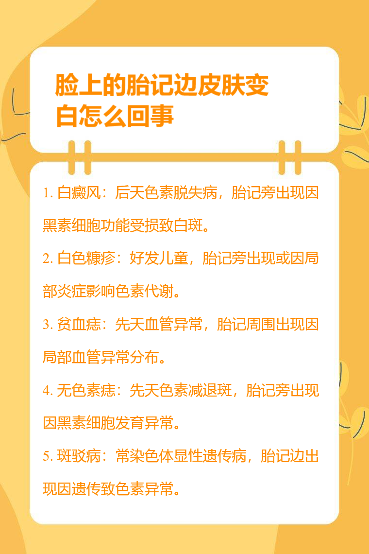 1. 白癜风:是一种常见的后天性色素脱失性皮肤黏膜疾病,发病机制尚不明确,可能与自身免疫、遗传、神经精神因素等有关。表现为皮肤出现边界清楚的白斑,可发生于身体任何部位,在胎记周边出现可能是局部皮肤黑素细胞功能受损,无法正常合成黑色素,导致皮肤变白。