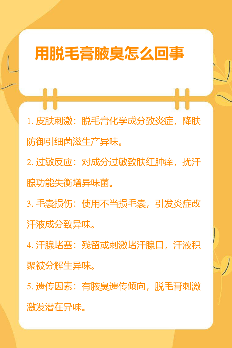 用脱毛膏后出现腋臭可能是由于皮肤刺激、过敏反应、毛囊损伤、汗腺堵塞、遗传因素等。