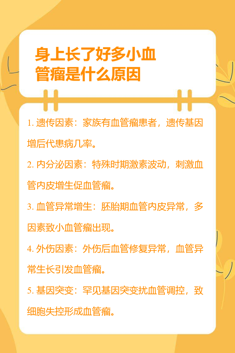 身上长了好多小血管瘤的原因有遗传因素、内分泌因素、血管异常增生、外伤因素、基因突变等。