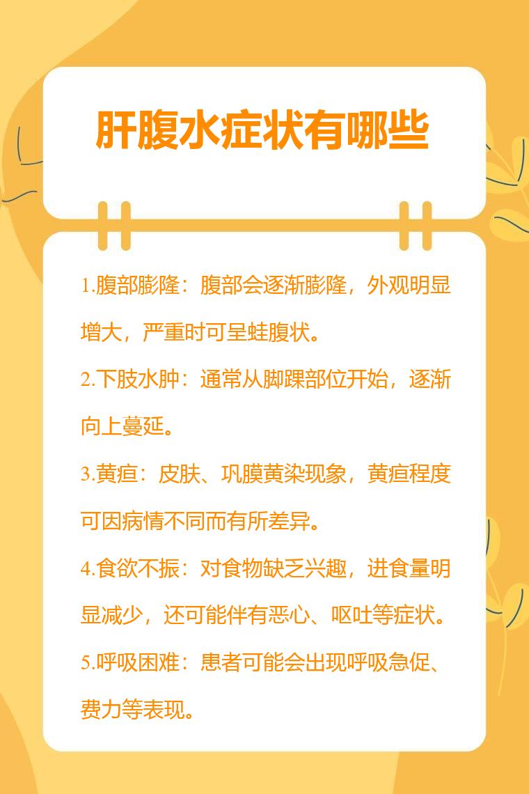 4.食欲不振:肝腹水患者常伴有消化功能障碍,会出现食欲不振的情况,对食物缺乏兴趣,进食量明显减少,还可能伴有恶心、呕吐等症状。
