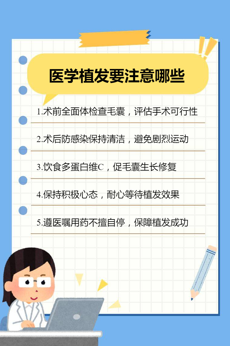 医学植发要注意术前检查、术后护理、饮食调整、心理状态、药物使用等。