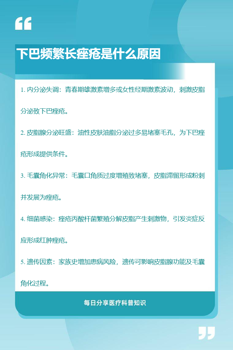下巴频繁长痤疮的原因主要有内分泌失调、皮脂腺分泌旺盛、毛囊角化异常、细菌感染、遗传因素等。