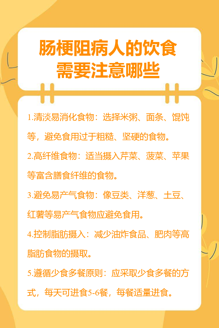 肠梗阻病人的饮食需注意清淡易消化食物、高纤维食物、避免易产气食物、控制脂肪摄入、遵循少食多餐原则等。