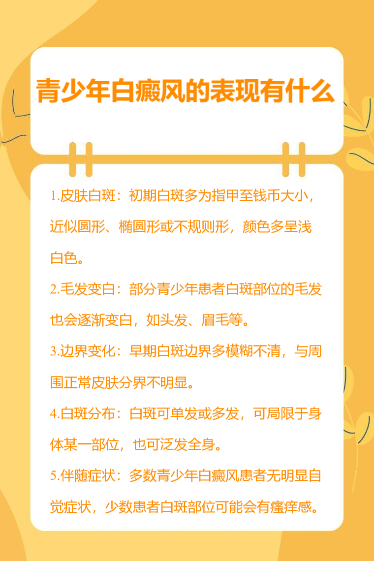 青少年白癜风的表现有皮肤白斑、毛发变白、边界变化、白斑分布、伴随症状等。