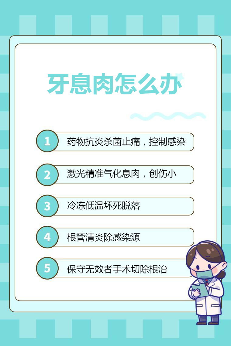 牙息肉可以通过药物治疗、激光治疗、冷冻治疗、根管治疗、手术切除等方法处理。