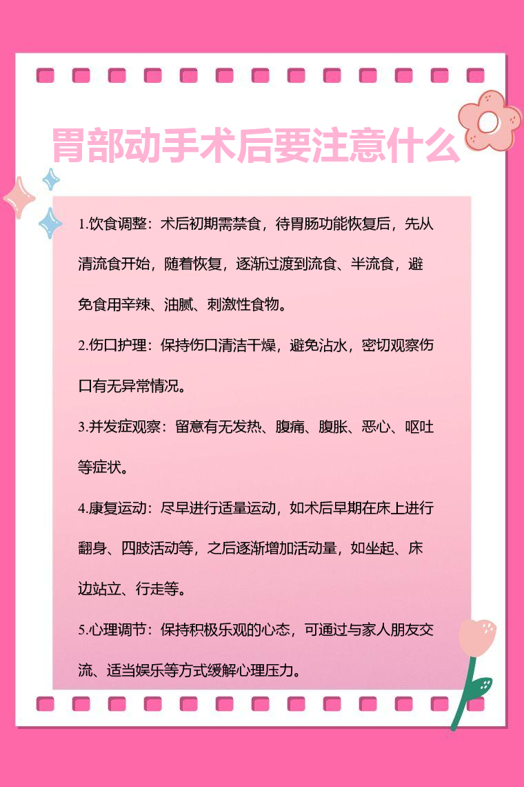 胃部动手术后患者要注意饮食调整、伤口护理、并发症观察、康复运动、心理调节等。