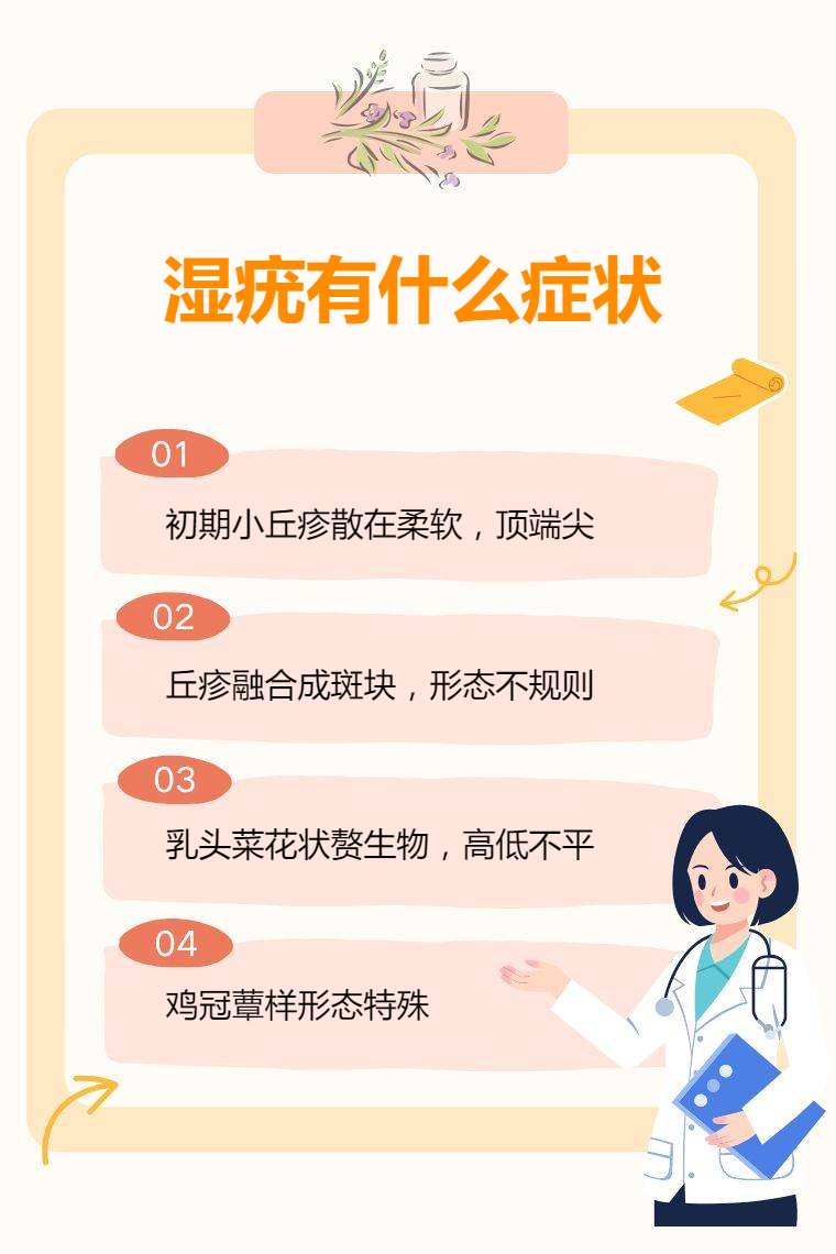 湿疣的症状包括丘疹、斑块、乳头样或菜花样赘生物、鸡冠样或蕈样赘生物等。