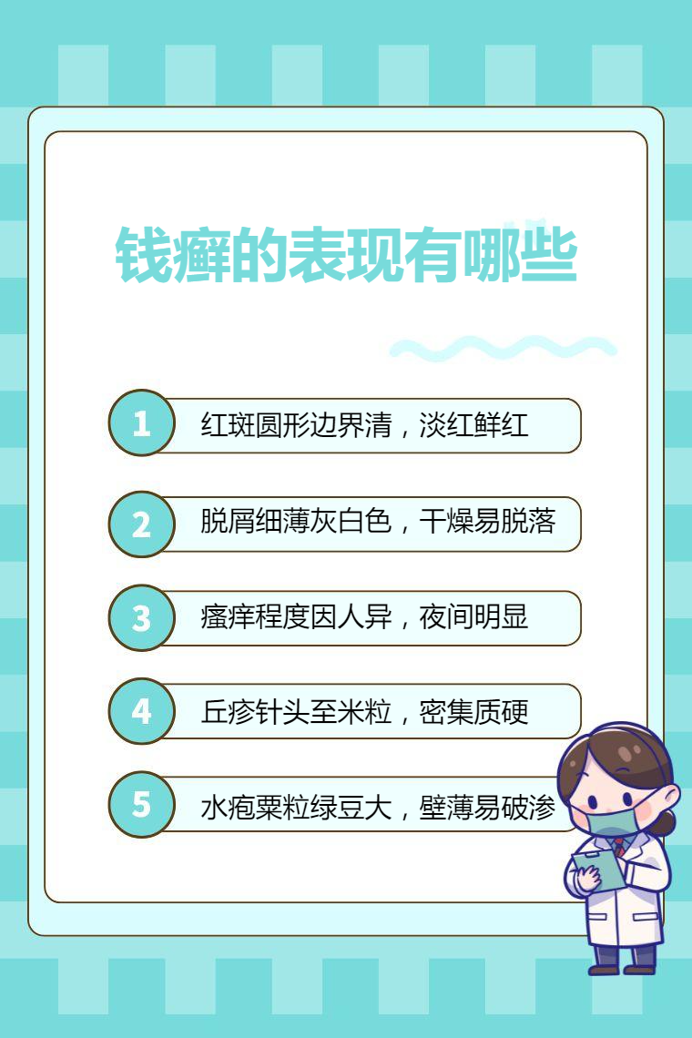 钱癣的表现有红斑、脱屑、瘙痒、丘疹、水疱等。